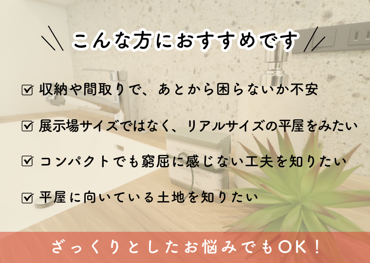 平屋ならではの工夫を、実際の住まいで体感してください。以下の3つの平屋モデルハウスにて、ご見学・ご相談いただけます。