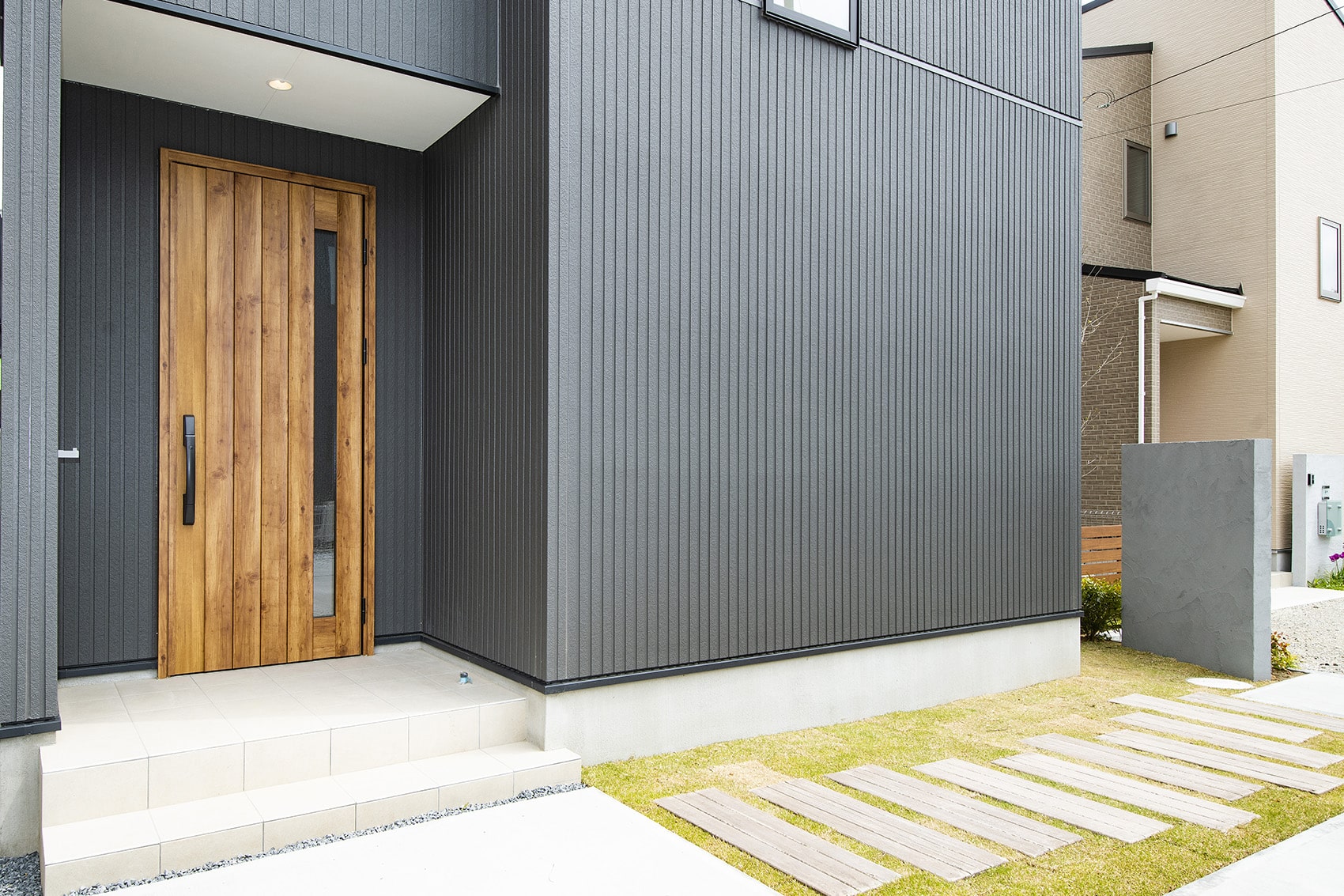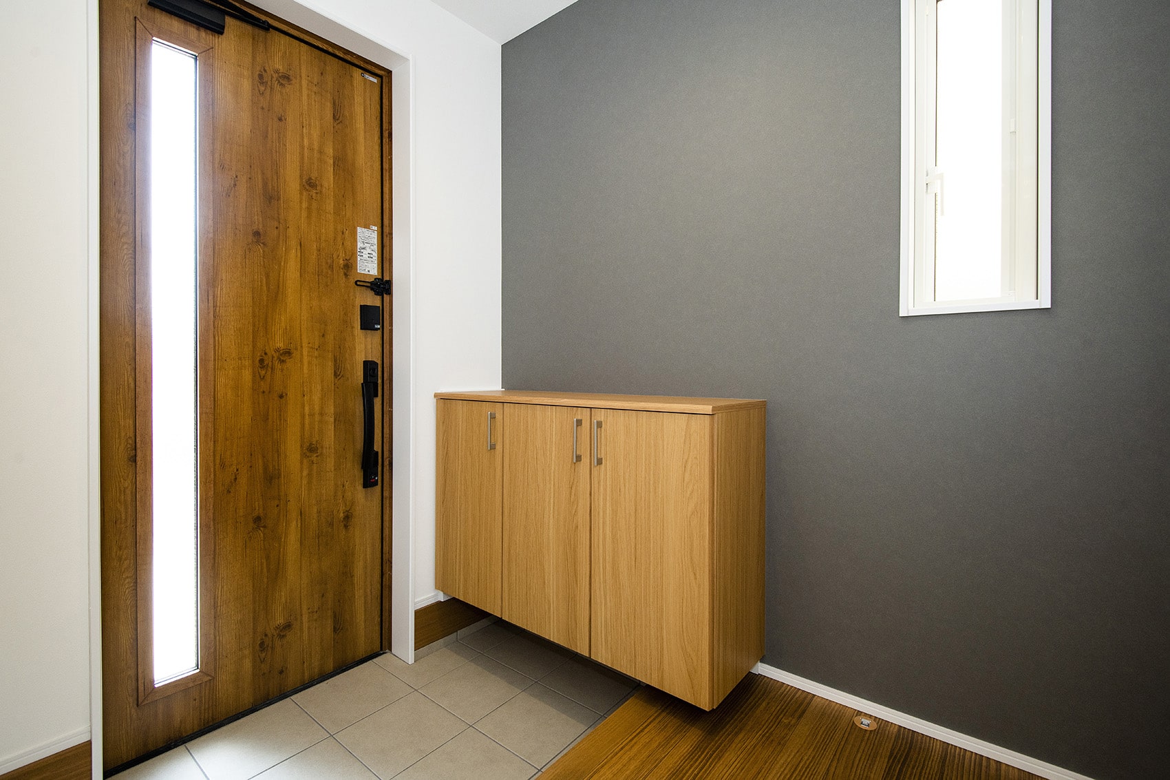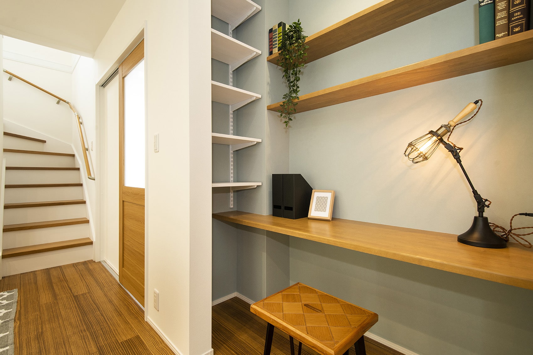 壁厚を利用してWi-Fiルーターなどを収納。インターホンや給湯器リモコンなども使いやすい高さにすっきりまとまります。